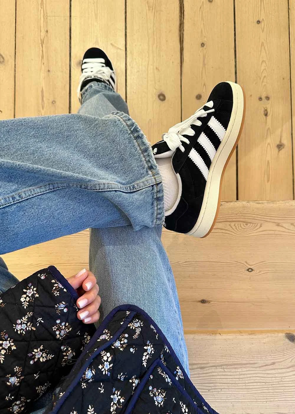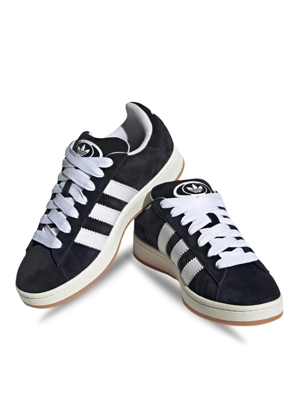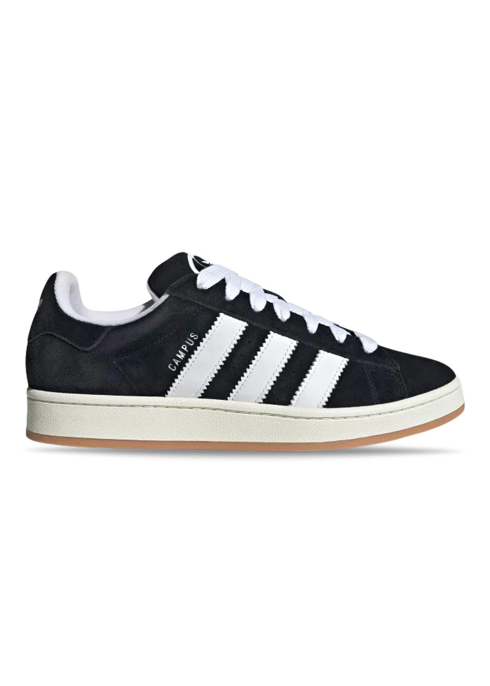 Campus 00S fra Adidas i sort med ruskindsdetaljer, tykke snørebånd, takkede Adidas striber på siden og logo foran.
