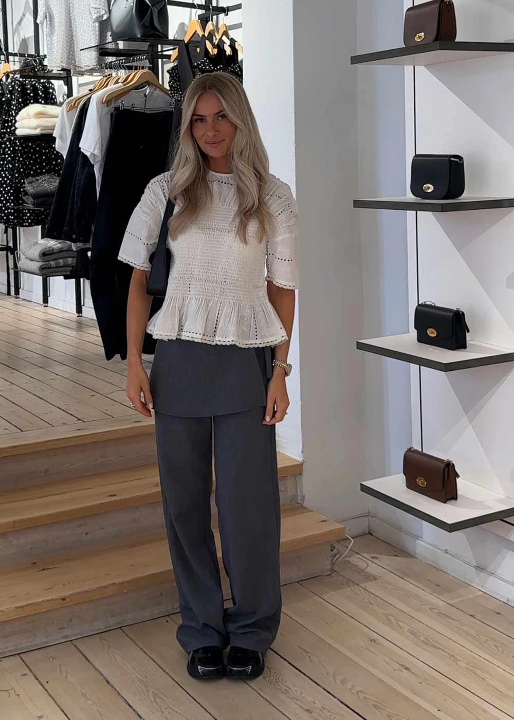 - Den første model er 167 cm og bruger str. XS
