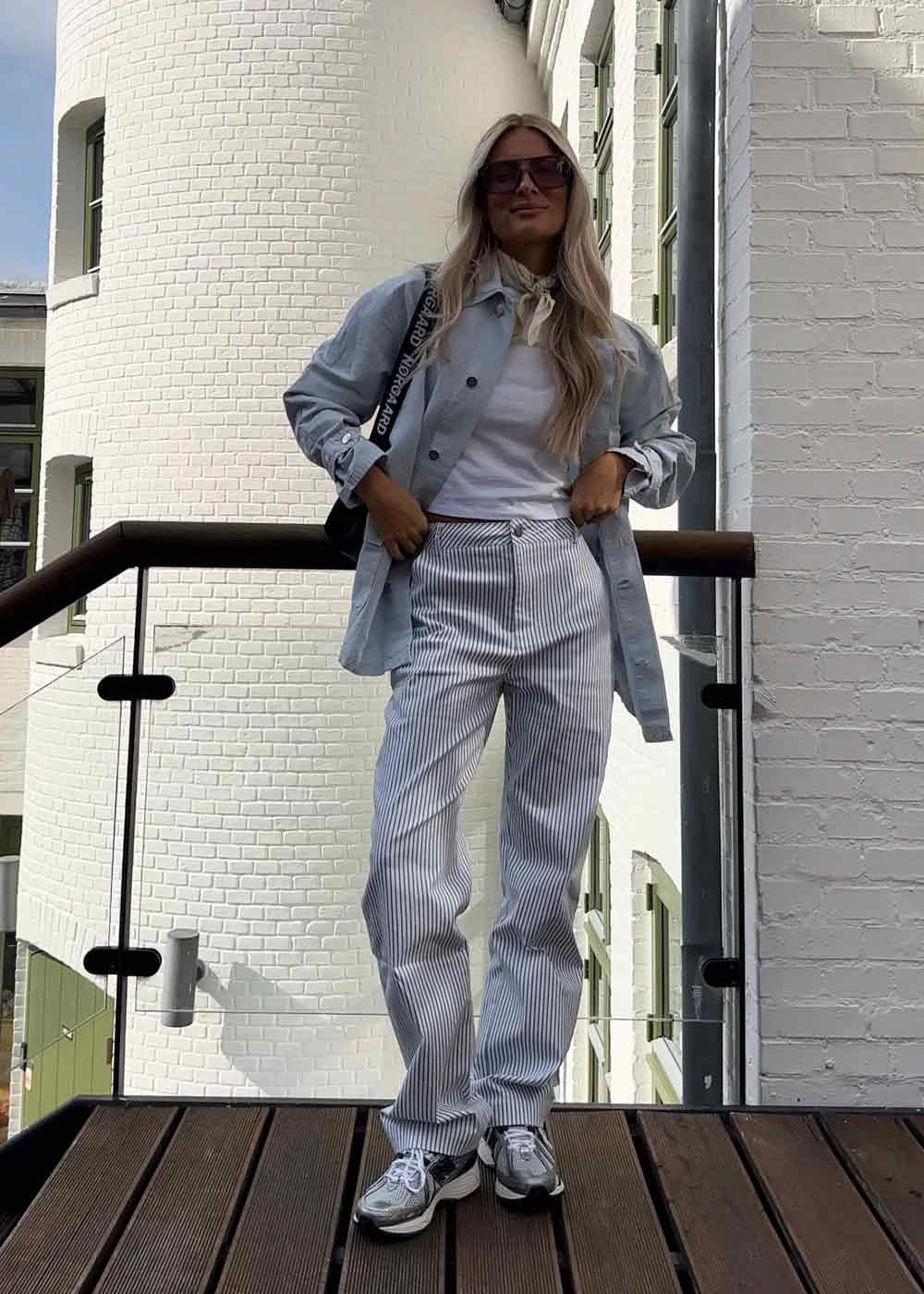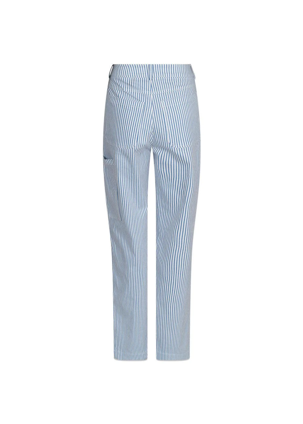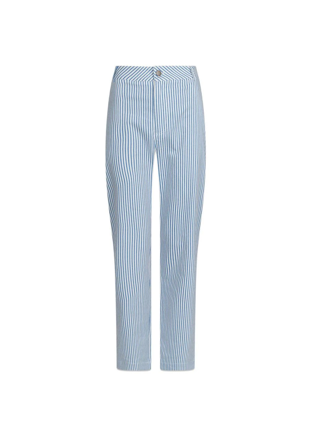 Zuzan er et par stribet bukser i blå fra Neo Noir. De har lynlås- og knaplukning, lige ben og en løs pasform.