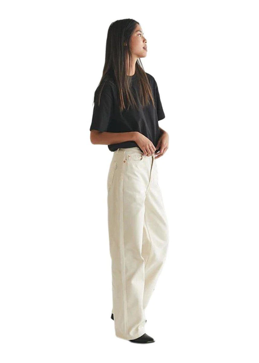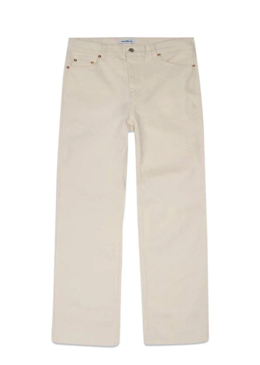 Højtaljede jeans fra Woodbird i en fin off white vask. Jeansene har lommer både foran og bagpå. Lukkes med lynlås og knap.